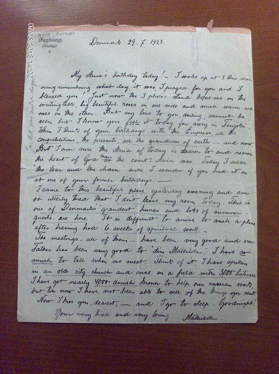 Матильда Вреде и Анна Александровна на одном из собраний. Tерийоки, 1923 -25 гг. Фото Музейного ведомства ![]() Фото из архива ![]() ![]() Дания. 29.07.1923. Сегодня у моей Ани День Рождения! Я проснулась в 3 часа, сразу вспомнив, какой сегодня день -- помолилась о тебе и благословила тебя! Сейчас передо мной на письменном столе 3 фотографии, красивые розы по одну сторону и маленькие розочки тёплого красного цвета, с другой стороны. И хотя мою любовь к тебе, дорогая, увидеть нельзя, я знаю, что ты сегодня чувствуешь её, находясь далеко в Терийоках. Иногда я задумываюсь о том, как же раньше проводила ты свои Дни Рождения вместе с Императрицей, о тех поздравлениях и подарках тебе, о той грандиозности (в бытовом понимании), с какой всё происходило и вот, что у тебя сейчас! Но я уверена, что сегодняшняя Аня ближе и дороже Господу, чем та Аня, которая была Придворной дамой. "Я ношу слёзы и цепи" - это про тебя сегодня, и, конечно же, невозможно было бы даже представить себе такое в прошлом на каком-нибудь твоём Дне рождения. Сейчас я тебя целую, дорогая, и иду спать. Спокойной ночи! Твоя очень уставшая, но любящая Матильда. Людмила Хухтиниеми. Перевод с английского К. Дукальской. 26.07.2018. |