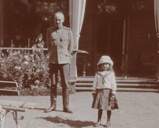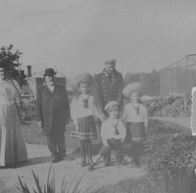 ![]() Анна Танеева на костюмированном Балу в Зимнем Дворце. 22 января 1903 г. Из альбома Анны «В семейном кругу часто говорили о том, что мне пора выйти замуж, но никто из молодежи, которая бывала у нас, не пленял моего воображения. Среди других часто бывал у нас морской офицер Александр Вырубов. В декабре он сделал мне предложение письмом из деревни, которое меня сильно взволновало и смутило. Приехав в Петербург, он стал ежедневно бывать у нас и терзал меня, умоляя скорее дать ему согласие. За одним из завтраков в феврале 1907 года, когда он пришёл сказать, что нашёл себе службу, меня поздравили его невестой. Все в доме и Вырубов сияли от радости, начались обеды, визиты, приготовление приданого. Меня осыпали подарками, и мне казалось, что я счастлива. Государыня тоже одобрила мою помолвку. Только Орлов выразил сомнение, советуя мне серьезно обдумать этот шаг. Это случилось во время моего дежурства в Дворце, и Государыня, войдя в комнату, решительно сказала, что нельзя меня смущать, раз слово уже дано». Близким родственником супруга Анны, А.В. Вырубова, был Дворцовый комендант Генерал В.Н. Воейков, приходившийся ему двоюродным братом. Скорее всего, именно в его доме состоялось и знакомство будущих супругов. Известно, что в бытность ещё командиром Лейб-Гвардии Гусарского полка (с 1907 г.), Владимир Николаевич принимал у себя Анну Александровну. ![]() Вырубов А.В. (1880-1919) Вырубов Александр Васильевич родился в с. Колтовское (Колышлейского района). Сын Василия Николаевича Вырубова (1844-1905) и Княжны Евдокии Александровны Львовой (1845-1904). После окончания Петербургского морского Корпуса (1900), проходил службу на дозорном крейсере I ранга «Светлана» в качестве вахтенного начальника. Крейсер «Светлана» в Цусимском бою был расстрелян и потоплен японцами. Лейтенант Александр Васильевич оказался в японском плену. ![]() Командующий эскадрой в своем Приказе отметил безпримерный случай в истории флота: «…Счастлив буду при первой возможности представить вниманию Высшего начальства об отличной распорядительности господ офицеров Вырубова и Яковлева и о значении их заслуг. Преклоняюсь перед возвышенным чувством этих юношей, благородным рвением к службе и такою же самоотверженностью. Спасибо молодцам водолазам, не впервые выручающим нас из беды…». Освободившись из плена в 1906 году, А. Вырубов возвратился в Россию. Произведенный вскоре после женитьбы в чин старшего лейтенанта, с 04.03.1907 г. по 05.05.1908 г. был назначен делопроизводителем Императорской Его Величества военно-походной Канцелярии. ![]() Анна Александровна, А. С. Танеев, А.В. Вырубов, Великая Княжна Мария Николаевна, Цесаревич Алексей Николаевич, Великая Княжна Анастасия Николаевна. Ропша, Ломоносовский район. https://otmacamera Ю. Ден: «Анна приходилась мне отдаленной кузиной, поскольку её дед и моя бабушка были родственниками....Она вышла замуж в том же году, что и я, но до брака была влюблена в Генерала Орлова, командовавшего уланами, большого друга Императрицы. Справедливо или нет, но Её Величество сочла, что Генерал Орлов слишком стар для Анны, и, хотя Генерал любил её и желал лишь одного - жениться на ней, Анна подчинилась воле Императрицы и приняла предложение лейтенанта Вырубова. Их венчали в Придворном храме в Царском Селе. Брак их оказался неудачным». Из дневника Государя: «1907 год. 4 февраля… Анна Танеева представила сво
