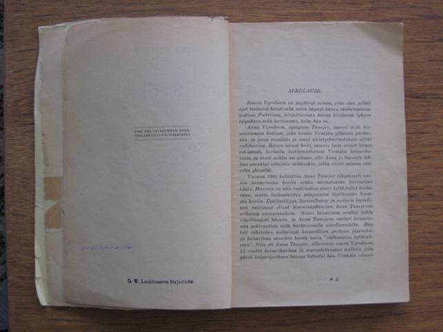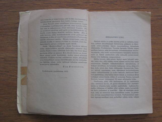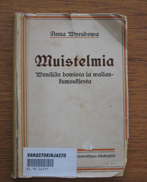 ![]() В издании на финском языке книги «Воспоминания о Русском Дворе и революции» Анне большую помощь оказала Матильда Вреде. По её просьбе издатель Вернер Сёдерстрём согласился взять в работу книгу и заплатить ей,согласно договору. «Условием публикации книги на финском языке будет то, что я должна буду написать предисловие для твоей книги. Я с удовольствием это сделаю и надеюсь как-то развеять полосу грязных, ложных слухов о твоих Высочайших друзьях». Из письма Матильды Вреде. Но случилось так, что в то самое время в издательстве г. Пори готовилась работа по переводу книги воспоминаний Анны, изданной в Швеции издательством Альберта Боннье. Матильдa с помощью X. Кахелина (Министр юстиции 1919-1920) разрешила создавшуюся ситуацию. Кахелин передал в г. Пори оригинальное русское издание, и по письменному уполномочию Анны, заключил договор на издание воспоминаний на финском языке. «Теперь они готовы платить тебе так же, как Сёдерстрём, т.е. 5 000 финских марок за тираж 3 000 экземпляров. Клише фотографий сделаны здесь под контролем Кахелина и меня. Я отказалась отправить твои фотографии в Пори». Из письма Матильды Вреде. 1923 г. ![]() Договор на издание книги на финском языке в Пори. Фото из архива Куопио ![]() ![]() ![]() Предисловием для книги послужило переведённое на финский язык то же самое предисловие, написанное мисс Эльзой Брандстрем для шведского издания. Без иллюстраций книга была издана в 1923 году. Из писем Матильды Вреде к Анне: «Я видела моего любимого брата в Коуволе он только что закончил [читать] твою книгу и был полон глубочайшего восхищения тобой, твоей великой и смелой любовью к Императорской Семье и отсутствием у тебя ненависти к тем, кто тебя преследовал. … 13.8.1923 Дания. До сих пор я ничего не знаю о датском переводе. Я не понимаю, почему они не отвечают. … 23.9.1923. Немецкий перевод отослан в Германию по адресу, который был дан переводчиком, во время отсутствия самого Кахелина, при посещении его офиса». Людмила Хухтиниеми. Фото А. Хухтиниеми. © Copyright: http://tsaarinikolai.com |