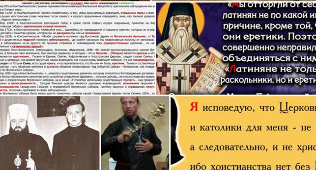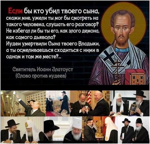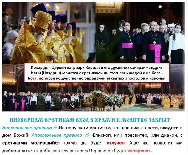 ![]() Источник: МОСКВА ТРЕТИЙ РИМ. Публикация от 8 июля 2019 года. ![]() ![]() Святитель Феофан Затворник. Толкование на 1-е Послание святого Апостола Павла к Солунянам (Фессалоникийцам): «Целовать заповедует Апостол лобзанием святым, таким, какое могут давать святые святым и какое прилично принимать святым от святых: в чистоте сердца, с почтительным отношением друг к другу, как к лицам, Бога в себе носящим. Или Святым лобзанием он называет лобзание любви, как святой Петр (1 Пет. 5, 14), в противоположность лобзанию предательскому, каково было Иудино». Объятия, целование свидетельствуют об единстве в любви. Единство символизируют жесты объятий, соприкосновение ликов – щека к щеке. Святые Отцы никогда ни целовались, ни обнимались с иноверными, но только с православными братьями и сестрами. Традиция чтения Евангелия лицом к алтарю ![]() «Чтение Священного Писания в алтаре – очень древний обычай, дошедший до нас с тех времен, когда только еще определялся устав Богослужения. Действительно, священник, не только при чтении Евангелия, но и при совершении священнодействий, стоит спиной к молящимся. Это свидетельство того, что он предстоит пред Богом: народ находится за ним. Это образ библейский – образ пастыря, пастуха, который, как известно, идет впереди своих овец, своего стада, и ведет его за собой. На практике это проявляется так: священник возглавляет Богослужение, от лица людей возносит молитвы к Богу, и, конечно же, он обращен туда, куда обращен народ <…>. Лишь однажды в году Евангелие на вечерне 1-го дня Пасхи читается лицом к народу: на Пасхальной литургии, когда как бы из дверей Гроба благовествуется о том, что Христос воскрес. Но этот случай специально оговорен Типиконом и тут заложен глубокий смысл этого пасхального чтения: в воспоминание вечернего явления Господа ученикам. Указ Патриарха, Священного Синода и Высшего Церковного Совета от 5 декабря 1919 года и распоряжение Митрополита Петра от 14 сентября 1925 года, чтение Евангелия лицом к народу упомянуто в ряду неразрешенных нововведений. https://www.blagogon.ru ![]() Криптохристианство (от древнегреч. «криптос» – «тайный», «укрытый») – это ересь, согласно которой якобы можно тайно быть христианином, а явно исповедовать другую религию, например, ислам. Криптохристианство является призывом к вероотступничеству, исламизации, иудеизации, католизации православных. Это древняя ересь, в настоящее время обеляемая адептами экуменизма с целью расшатать церковное учение о том, что спасение возможно только в Православии. ![]() ![]() Представитель ОВЦС МП заявил, что Дух Святой продолжает действовать у папистов Презентация книги главного редактора Издательства Московской Патриархии епископа Балашихинского Николая о католике «Спешите делать добро. Доктор Федор Петрович Гааз», состоялась 23 января в мемориальной комнате-музее доктора Гааза в историческом здании созданной им больницы, бывшей Александровской, ныне – НИИ гигиены и охраны здоровья детей и подростков. О подробностях очередного апостасийного события сообщает униатское информагентство «Благовест-инфо». Читать полностью https://vseeresi.com/2020/01/25/2020- ![]() Молитвы с еретиками, папизм, протестантизм, экуменизм В пятницу, 24 января, в римо-католическом храме свв. Иоаннов в г. Вильнюсе в рамках недели молитв о единстве христиан была совершена заключительная молитва, — соо