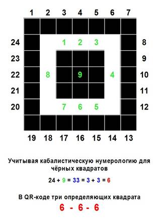 9+24=33, 3+3=6По кабалистической нумерологии, которую использовали слуги антихриста в разработке QR-кода, каждый из трех квадратов означает цифру 6. Как и в штрихкоде EAN-13 три двойных полоски означают - 666, так и в QR-коде три черных квадрата в углах штрихкода означают - 666. Расстояние между "внутренним" квадратом и "внешним" задаёт интервалы для считывания информации в самом коде по горизонтали и по вертикали. Как в штрих-коде первые две удлинённые полосы задают интервал для считывания всего штрих-кода, а последние удлинённые - заканчивают алгоритм считывания, так и в QR-коде квадраты играют роль "ключа" для считывания заложенной информации внутри самого QR-кода... А на Руси уже есть храмы зашестеренные QR-кодами: