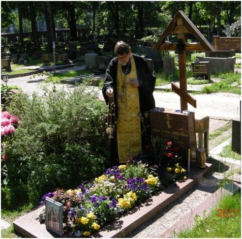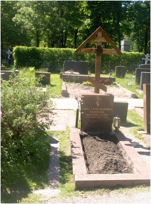 Время шло, гранитный Крест на могилу мон. Марии (АА. Танеевой) все еще не был установлен. Были месяц в неведении, когда сообщат об этом. На кладбище встретились с о. Тимофеем, чтобы отслужить на могиле панихиду. Еще до панихиды подошел смотритель кладбища и попросил меня убрать с могилы цветы, чтобы завтра они смогли начать работу. Панихиду о. Тимофей отслужил.