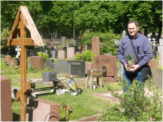 Фото А. Хухтиниеми К могиле подошел р. Б. Антоний из СПБ. С розами, свечами. Он, как выяснилось, прилетел самолетом из Бельгии и зашел к матушке Марии поблагодарить ее за удачную поездку. ![]() Антоний из СПБ. Фото А. Хухтиниеми Антоний вкратце рассказал о бельгийском храме в честь святого праведного Иова Многострадального, в котором он был на Божественной Литургии, о реликвиях храма. В храме четыре мраморные доски: на двух увековечены имена членов Царской семьи, на других — молитва о «умученных и убиенных большевистской богоборческой властью». В храме находится икона Иоанна Крестителя, из Ипатьевского дома (расположена над Царскими вратами), Библия Императрицы Александры Федоровны, погон и шинель Императора Николая II, а также стул, на котором он сидел в 1916 году на фронте, подаренные Великой княгиней Ксенией Александровной. В июле 2012 года, в Брюсселе при реставрации храма, в стене были обнаружены материалы с вещественными доказательствами следователя Николая Соколова по делу в 1919 году об убийстве Царской семьи . В обнаруженных свинцовых цилиндрах находилась записка об истории этих вещественных доказательств, а также стеклянные сосуды, в которых была земля, глина, смешанная с жировыми выделениями, которые остались на месте сжигании тел в Ганиной Яме. Все это после реставрации вновь было вмонтировано в стену и является местом памяти и поклонения святым Царственным мученикам. На полках вдоль стен размещены иконы, пожертвованные русскими людьми. На хорах находятся знамена Императорской и Белой армии. Правда об убийстве Царской семьи обличала богоборцев. Н. А. Соколов умер насильственной смертью в возрасте 42 лет. Книга «Убийство Царской Семьи. Из записок судебного следователя Н. А. Соколова», отредактированная посторонними лицами, была опубликована уже после его смерти в 1925 году.