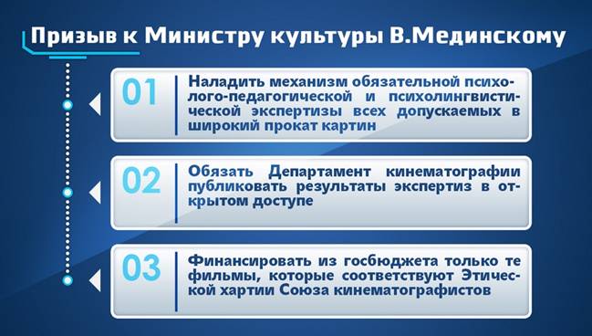 Всё большему числу людей сегодня становится очевидно, что кинематограф не только развлекает, но и формирует стереотипы поведения зрителей, воздействует на сознание и подсознание человека и, по сути, является одним из основных инструментов бесструктурного управления обществом. Об этом уже прямо говорят на центральных телеканалах, правда, пока только в привязке к внешнеполитическим событиям. Но ведь с помощью кино можно продвигать не только политические идеи, но и многое другое: можно пропагандировать трезвость (“Поддубный”), а можно делать всех главных героев пьющими (“Горько 2″); можно пропагандировать любовь к Родине (“Крепость”), а можно изображать свою страну грязной и отсталой (“Левиафан”). И самое главное – можно пропагандировать высокие нравственные стандарты, а можно дискредитировать и высмеивать идеи честности, порядочности, трудолюбия, превращать преступников в героев, а положительных персонажей делать неудачниками. А чтобы человек лишний раз и не думал о высоком, можно под предлогом свободы слова такие понятия как совесть, долг, целомудрие, Отечество вообще исключить из лексикона и не использовать их. Ведь технология абсолютна та же самая, что и с политической пропагандой. И сегодня любой здравомыслящий человек, который хоть иногда включает телевизор или ходит в кино, подтвердит, что речь идёт не об абстрактных вещах, а о современной действительности. СМИ сегодня есть инструмент идеологии, а не информации. Главное в их сообщениях – идеи, внедряемые в наше сознание контрабандой. (С.Г. Кара-Мурза) Учитывая, что российский кинематограф по большей части финансируется государством, а все фильмы, демонстрируемые на широком экране, в том числе иностранные, проходят обязательную регистрацию в Министерстве культуры, проект Научи хорошему совместно с проектом Политическая практика с апреля 2015 года многократно обращались в данное ведомство с требованием провести экспертизу и снять с проката картины, в которых озвученные ранее технологии манипуляции реализованы наиболее наглядно. В своих обращениях мы опирались на «Основы государственной культурной политики Российской Федерации», Концепции государственной семейной и демографической политики, другие стратегии и документы, утверждённые Правительством и Советом Безопасности, а также на заявления Президента по данному вопросу. Напомним: ещё в 2011 году Президент лично обратился к правительству и деятелям кинематографа, призвав не снимать картин, подрывающих нравственность. Этическая хартия кинематографистов была принята в 2014 году. Кто из создателей кино её соблюдает? В ответ на все наши обращения от Министерства культуры мы получили абсолютно откровенные отписки, составленные с нарушением действующего законодательства. В своей официальной позиции Минкульт в лице директора департамента Кинематографии Вячеслава Тельнова и его замов продемонстрировали полную безынициативность и принципиальный саботаж по указам Президента России и федеральному законодательству. Более того, как выяснилось в ходе нашего обращения по педофильскому фильму 14+, в съёмках которого в эротической сцене были задействованы актёры, которым не исполнилось 16 лет, Министерство культуры не только допускает такие фильмы к прокату, но ещё и финансирует их из госбюджета. И если, благодаря