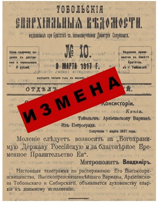 2 марта 1917 г. в покоях московского митрополита состоялось частное собрание членов Синода и представителей столичного белого духовенства. На нем присутствовали шесть членов высшего органа церковной власти — митрополиты Киевский Владимир (Богоявленский) и Московский Макарий (Невский), архиепископы Финляндский Сергий (Страгородский), Новгородский Арсений (Стадницкий), Нижегородский Иоаким (Левицкий) и протопресвитер А. Дернов, а также настоятель Казанского собора протоиерей Ф. Орнатский. Тогда же синодалы признали необходимым немедленно установить связь с Исполнительным комитетом Государственной думы (Временным комитетом Государственной думы — ВКГД). Таким образом Св. синод РПЦ признал преступную «революционную» власть — это при законно правящем Государе Императоре: несостоятельное де-юре «отречение» Государя Николая II от Престола состоялось в ночь со 2 на 3 марта (как мы знаем, безликая записка карандашом на телеграфном бланке заведомо не имела никакой законной силы). Первое после государственного переворота и свержения Монархии официально-торжественное заседание Св. синода состоялось 4 марта. На нем председательствовал митрополит Киевский Владимир и присутствовал новый синодальный обер-прокурор. От лица Временного правительства В.Н.Львов объявил о предоставлении РПЦ свободы от опеки государства, «губительно влиявшей на церковно-общественную жизнь». Члены Синода (за исключением отсутствовавшего митрополита Питирима) также «выразили искреннюю радость по поводу наступления новой эры в жизни Церкви» (Нижегор. церков.-обществ, вести, Н.Новгород, 1917. № 7. С. 113). Митрополит Арсений (Стадницкий) говорил о появлении перед Российской Церковью «больших перспектив», открывшихся после того, как «революция дала нам свободу от цезарепапизма (!)» (Новгород. ЕВ. Новгород, 1917. № 7. Часть неофиц. С. 324—325, №11. Часть неофиц. С. 451). Тогда же из зала заседаний Синода по инициативе обер-прокурора было вынесено в архив царское кресло, которое в глазах иерархов РПЦ являлось «символом цезарепапизма в Церкви Русской» (Новгород. ЕВ. Новгород, 1917. № 11. Часть неофиц. С. 451), то есть «символом порабощения Церкви государством». Оно предназначалось исключительно для Государя и находилось рядом с креслом председательствующего. Достаточно знаменательно, что вынести его обер-прокурору помог первоприсутствующий член Синода — митрополит Владимир (Богоявленский) (Бирж, ведомости. Пг., 1917. № 55. С. 4). Царское кресло решено было сдать в музей… Уже 6 марта Св. синод распорядился, чтобы во всех церквах Петроградской епархии многолетие Царствующему Дому «отныне не провозглашалось» (Рус. слово. М., 1917. №51.С. 2). Эти действия Синода имели символический характер и свидетельствовали о желании его членов «сдать в музей» не только кресло Царя, но «отправить в архив» истории и саму Царскую власть. Непосредственно на сфабрикованные фальшивки: «Акт об отречении Николая II от Престола государства Российского за себя и за сына в пользу Великого князя Михаила Александровича» от 2 марта 1917г. и «Акт об отказе Великого князя Михаила Александровича от восприятия верховной власти» от 3 марта Синод отреагировал нейтрально: 6 марта его определением эти акты решено было принять «к сведению и исполнению» и во всех храмах Империи отслужить молебны с возглашением многолетия «Богохранимо