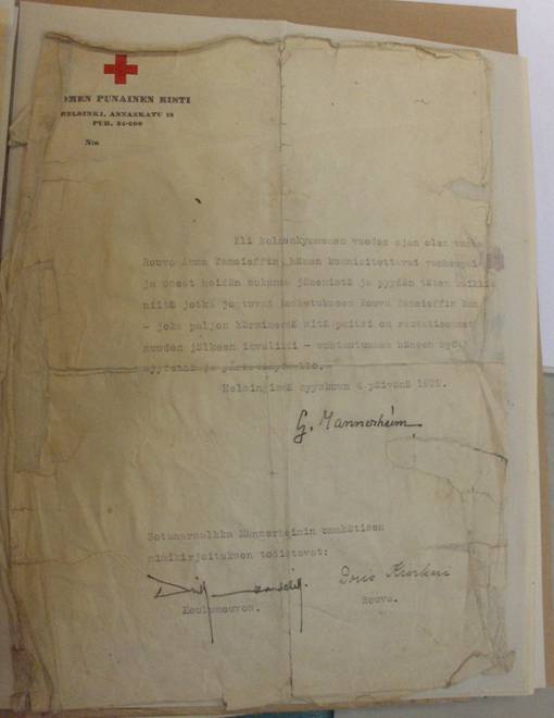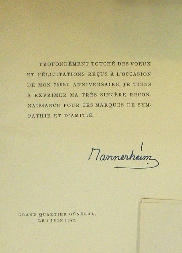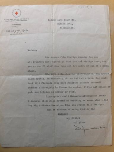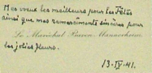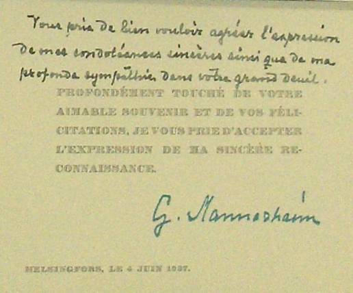 ![]() Карл Густав Эмиль Маннергейм (4 (16) июня 1867, Аскайнен, Або-Бьёрнеборгская губерния – 27 января 1951, Лозанна, Швейцария). Офицер Имперской армии. Фото из Википедии К. Г. Маннергейм был представлен Анне Александровне в Царском Селе в 1908 году, когда он только что вернулся из Азиатского похода. После этого, приезжая в Царское Село, он несколько раз был в её маленьком домике, рядом с Царским Дворцом. Анна Александровна со свойственной ей доброжелательностью к людям была рада гостям и всегда радушно принимала их. ![]() Анна Александровна Танеева (16/29июля 1884 – 20 июля 1964). Фото инет В январе 1909 года гостями в доме Анны была Царская Чета, а также и К.Г. Маннергейм. Это было незадолго до его отправления в Польшу. ![]() Справа К. Г. Маннергейм, Генерал-майор Свиты Его Императорского Величества. Спала. Из коллекции Анны ![]() Фото из журнала «Солнце России» № 9 (367) за апрель 1917 г. Последняя встреча и беседа Анны Александровны и Карла Густава Маннергейма в России состоялась в феврале 1917 года в Александровском Дворце. ![]() Анна Александровна, Александровский Дворец После побега в Финляндию, их дружеские отношения продолжились. К.Г. Маннергейм следил за событиями, происходившими в России и по рассказам приближенных знал о том, что Анна Александровна была узницей Трубецкого бастиона Петропавловской крепости, содержалась под стражей в крепости Свеаборг, затем жила с матерью, Надеждой Илларионовной в Терийоках и в Выборге. Из Выборга Анна Александровна посылает К.Г. Маннергейму красивую русскую рождественскую открытку с самыми наилучшими пожеланиями. Доброжелательный текст завершала подпись: «Анна Танеефф, Ваасанкату, 13, Виипури». Генерал от Кавалерии Финляндской армии сразу ответил Анне обычным письмом по-французски, не используя свои официальные бланки: «Дорогая Мадам, меня очень обрадовало, что Вы вырвались из революционного петроградского ада и живете в семье благородных людей Акутиных, которых я хорошо знаю». В июле 1930 года Густав Маннергейм на пути в Терийоки, на виллу «Бьянка», был проездом в Выборге. Анна Александровна намеревалась встретиться с ним, но сразу же по приезде в Выборг Генерал заболел и вернулся в Хельсинки. ![]() Тайная монахиня Мария (А.А. Танеева). Финляндия, Выборг, 1937-1930 годы Последние годы жизни Анны Александровны в Выборге, помимо всего прочего, омрачались продолжительной болезнью, а затем и смертью матери13 марта 1937 года, которая понимала и поддерживала Анну как в радости, так и в горе, разделяла вместе с дочерью крестный путь жизни. Отпевание было совершено в выборгском Преображенском кафедральном соборе. Похоронена на кладбище Ристимяки. Фельдмаршал Финляндии, Г. Маннергейм узнав о том, что у Анны Александровны большое горе, прислал ей сердечную, сочувственную телеграмму, в которой вспоминал встречи с её матерью в Петербурге. В июне 1937 года Г. Маннергейм отправил Анне Александровне: ![]() Национальный архив «…Глубоко тронутым Вашими добрыми воспоминаниями и поздравлениями, прошу Вас принять выражение искренней благодарности». Г. Маннергейм. Гельсингфорс, 4 июня 1937 г. После войны отношение к русским было неоднозначным. И тогда Анна Александровна обратилась с просьбой о встрече к своему старому знакомому, надеясь получить помощь и защиту. Об этой встрече рассказывает Л.В. Власов в своей книге «Женщины в судьбе Маннергейма»: «В день и