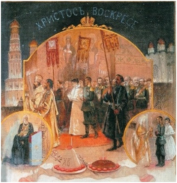 «Пасху отмечали особенно торжественно. Перед войной Пасхальное Богослужение проводилось в Петербурге, в Зимнем дворце, после которого был официальный Прием. Если Императорская семья находилась в Царском Селе или в Крыму, Богослужение там совершалось в Дворцовых церквах. Для Царской семьи готовилась пасхальная трапеза — куличи, пасха, пасхальные торты и, конечно, крашеные яйца. ![]() Царская семья на Богослужении и Крестном ходе В России был обычай после Пасхального Богослужения приветствовать близких людей поцелуем. Так и Государь в день Христова Воскресения, где бы он его ни праздновал, в Царском Селе или в Крыму, целовал своих солдат. Помню, как мы в Крыму стояли за большой стеклянной дверью и смотрели на эту церемонию, происходящую во дворе великолепного Ливадийского Дворца.
