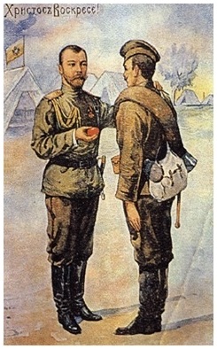 Государь Император Николай Александрович поздравляет с праздником Светлой Пасхи чинов Л-Гв.Преображенского полка. 1900-е годы На Пасху в Крыму было дивно. Цвели всевозможные фруктовые деревья и дурманящие чудесные запахи наполняли воздух. Пасхальные Богослужения проводились в красивейшее время года. На Страстный Четверг — особо почитаемый день Русской Православной Церкви — Царская семья ходила причащаться Святых Христовых Таин. Войдя в церковь, члены Царской семьи становились перед алтарем, делали поклоны и прикладывались к иконам. В белом платье, с вуалью, Государыня была очаровательной, хотя и была тогда слегка худой и выглядела болезненной. На нашем последнем Богослужении сердце Государыни было настолько слабо, что ей было тяжело как поклониться, так и встать с колен. Трогательно и нежно маленький Алексей помогал и поддерживал свою маму. Государь был небольшой ростом, и ему надо было тянуться на цыпочках, целуя высоких солдат, которые деликатно наклонялись в его сторону. Некоторые из них давали Государю красное пасхальное яйцо, получая взамен фарфоровое, украшенное инициалами Государя. Государыня, в свою очередь, посещала школы. Школьницы, молодые девочки, получали пасхальный поцелуй Государыни. Она также раздавала, как и Государь, украшенные ее инициалами фарфоровые яйца. Пасхальным поцелуем приветствовались также и во дворце — этим Государь и Государыня показывали, что они помнят своих подданных. Я удостоилась первого пасхального поцелуя от Государя, когда играла с детьми в детской. Государь вошел туда совсем неожиданно, вначале поцеловал меня, а затем своих детей. Пожалуй, трудно понять, какая была великая честь получить Царский поцелуй, если не знать, как искренне мы боготворили Государя. Я была в восторге, и чуть было не потеряла сознание». Из воспоминаний А.А. Танеевой. В первые годы Царствования молодой Государь с супругою по установленному Церемониалу в Пасхальную полночь возглавлял шествие в пышном кортеже по парадным залам Зимнего дворца к Большой церкви, совершая все положенные ритуалы торжественного Богослужения. Он часто лично участвовал в выносе Плащаницы. На заре, по окончании Литургии, Царское семейство собиралось для Пасхальной трапезы с куличами, пасхами и крашеными яйцами в великолепной Малахитовой гостиной, примыкавшей к личным покоям Императора. Из дневника Николая Александровича: "Легли спать около 4 часов утра, когда заря уже занималась... В 11.30 часов началось Христосование со всеми людьми в Малахитовой; почти 500 человек получили яйца". В последующие дни продолжались поздравления, Христосования, раздача даров родственникам, Придворным чинам, свите, служащим Дворца, число которых достигало тысячи человек. Прошли годы... В 1913 г., когда отмечалось Tрехсотлетие Дома Романовых, Царская Чета и их пятеро детей праздновали Пасху в Александровском дворце Царского Села. Царь, присутствовавший на ночном Богослужении со своими детьми, вспоминал: "Крестный ход при чудном восходе солнца, мне очень напоминает Москву, Успенский собор и ту же службу. Дети красили яйца с офицерами яхты... Одарили друг друга после обеда... Алексей был в церкви в первый раз и по окончанию заутрени с Анастасией (младшая дочь) вернулся домой. Служба была торжественная и замечательно красивая в нашем прелестном храме". ![]() Открытка 191